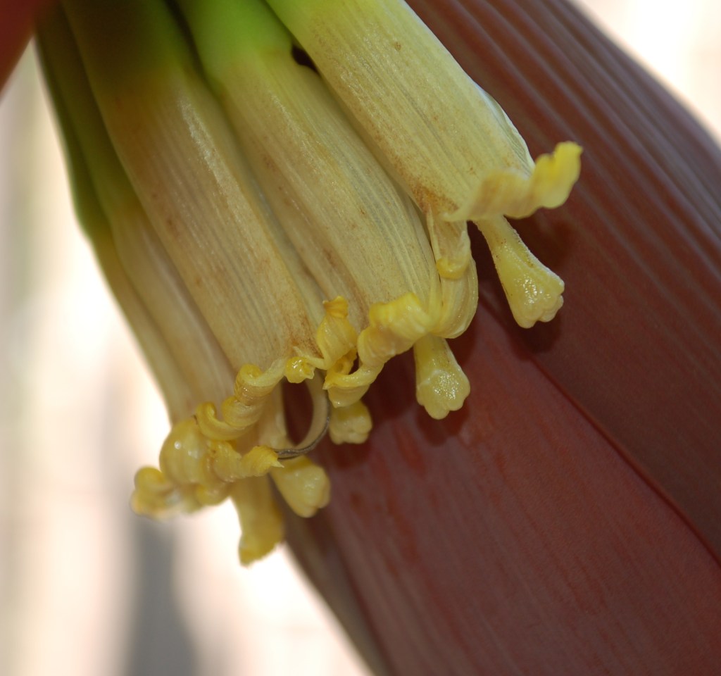 Over weeks, the pendant flushed with dew-tipped flowers that greened with banana beginnings. In late fall, I slid the plant into the warmth of its waiting glassed-in room. The bananas slowly swelled and stretched to their utmost, about 4.5 inches. They stayed green and stiff, seemingly in no rush to ripen.