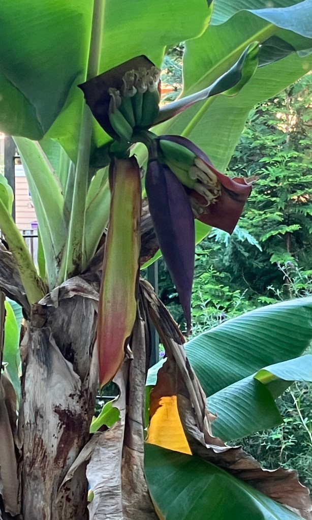 The plant gave no sign of fruit. The pot got heavy, especially pulling it inside for winter and out for summer. Toward the end of the plant’s third summer, I was shocked. A purple-hued leaf sheaf had popped, reaching from the top crotch.