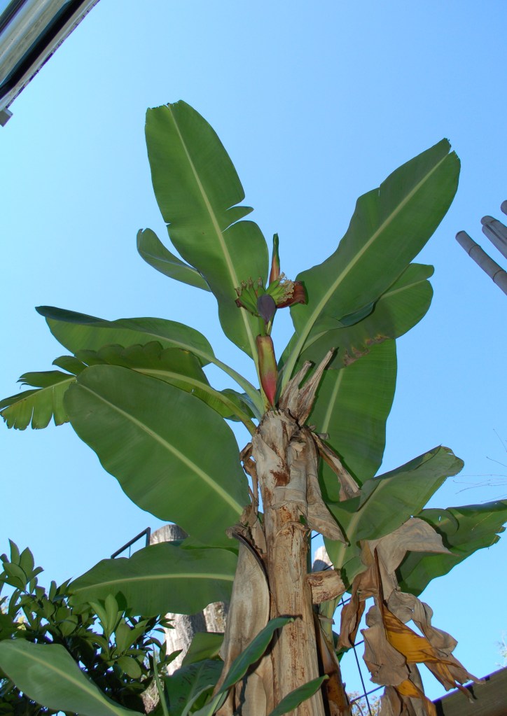 I decided three years ago to roll the banana dice and bought a dwarf variety. I put it in a pot. It grew heartily. I put it in a bigger pot, and then an even bigger pot. Leaves unrolled to 8 ft. tall. New shoots shot up around the main stem.