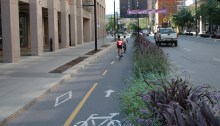 A planted median separates automobile lanes and a two-way bicycle course along a section of Boulevard De Maisonneuve. © 2016 John A. Bray